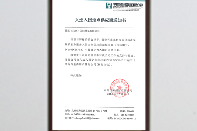 經項目評標委員會評審,我司在北京市文化局展覽展示承辦服務入圍定點供應商招標項目(招標編號: